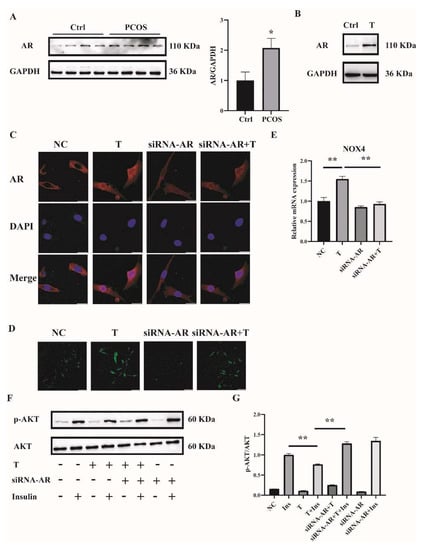 We next examined NOX4 expression and cell insulin signaling after AR knockdown in C2C12 cells. Knockdown of AR significantly reduced the mRNA expression of T-induced NOX4 (Figure 6E). Consistently, the ratio of p-AKT/AKT was increased with the treatment of siRNA-AR+T+Insulin compared with T+Insulin, indicating the upregulated insulin sensitivity in the cells when AR expression was knocked down (Figure 6F,G).