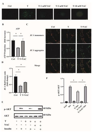 To investigate whether reducing ROS could ameliorate mitochondrial function and cell insulin resistance, an antioxidant NAC was used. Fully differentiated C2C12 cells were treated with T (10−5 M) or T (10−5 M) plus NAC (1, 2, and 10 mM) for 12 h. ROS production was then measured. As shown in Figure 7A, ROS levels were decreased in cells treated with T+NAC in a dose-dependent manner compared with T treatment alone. In the subsequent experiments, 1 mM of NAC was then used to treat the C2C12 cells in combination with T. The cotreatment of NAC with T significantly upregulated ATP levels and mitochondrial membrane potential (Figure 7B,D), indicating the amelioration of mitochondrial function in T-treated C2C12 cells by reducing ROS levels. In addition, cell insulin sensitivity was measured. The increased ratio of p-AKT/AKT in C2C12 cells treated with T+NAC+Insulin in comparison with T+Insulin treatment suggested the increased insulin sensitivity in T-treated cells (Figure 7E,F). In general, these results suggest that reducing ROS by the treatment with antioxidants such as NAC improved T-induced mitochondrial function and ameliorated insulin resistance in C2C12 cells.
