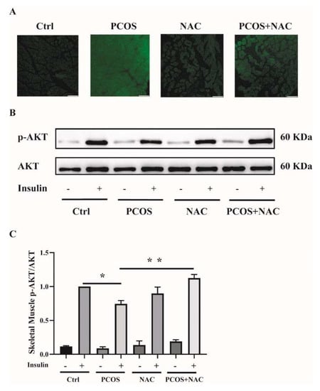 To further confirm the effect of antioxidants on skeletal muscle insulin resistance in mice with PCOS, NAC was given to DHEA-induced PCOS mice when modeling. ROS production was measured in soleus muscle tissues. ROS levels were attenuated in PCOS+NAC mice (Figure 8A). Additionally, the insulin sensitivity of skeletal muscle was detected. The blunted phosphorylation of AKT in PCOS mice was rescued by NAC intervention, as shown in Figure 8B,C. These results suggested that reducing ROS levels by antioxidants could improve skeletal muscle insulin sensitivity in mice with PCOS.