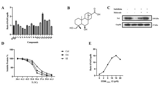 6,19−dihydroxy−ent−trachiloban−17−oic acid (compound 12) interacts effectively with hNcl. (A) Results of the CETSA−based screening of a small library of diterpenes. (B) Chemical structure of compound 12. (C) DARTS experiment results. (D) Thermal denaturation curve of hNcl in HeLa cell lines untreated or incubated with oridonin or compound 12. (E) CETSA-based measurement of the EC50 of compound 12 in HeLa cells.