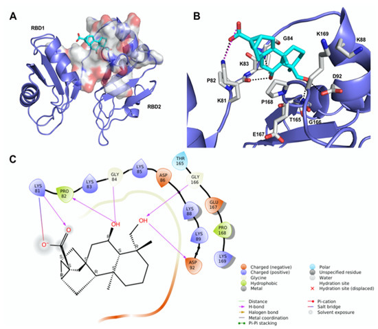 We undertook docking studies using Glide to describe the interaction between 12 and RBD1,2. RBD1,2 form a molecular clamp to bind the RNAs and are reported targets of the aptamer AS1411 [29,30,31,32] and small-molecule natural products [33]. Both RBD1,2 adopt a βαββαβ fold, common to other RBDs, and are connected by a flexible linker that becomes more structured upon RNA binding [34]. We initially identified druggable cavities on RBD1,2 that might be able to bind to 12 using the site-detecting software SiteMap [35,36] on the ensemble of 20 NMR structures of RBD1,2 from human nucleolin (Protein Data Bank ID: 2KRR) [29]. A SiteScore cut-off of 0.8 was employed to focus the docking calculations only on the most relevant sites [35,36] using an ensemble-based approach and the best-scored pose of 12 was selected to represent the ligand-binding mode [37]. As shown in Figure 2A, compound 12 is hosted in a 288 Å3 cavity lodged between the linker and RBD2. The carboxylic moiety of 12 established an H-bond and a tight salt bridge with K81 (Figure 2B,C). Moreover, the OH group at position 6 forms an H-bond with the CO backbone of P82 and, in turn, accepts an H-bond from the NH backbone of G84. In addition, the OH group at position 19 engages further H-bonds with the side chain of D92 and the NH backbone of G166. The ent-trachiloban skeleton forms additional hydrophobic interactions with the side chains of P168 and K81. Our results underscore that the 12/RBD1,2 interaction is critical, thus suggesting that compound 12 might impair the stabilization and further processing of RNA.