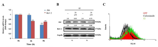 In addition, the number of messengers for Akt was lowered following cell incubation with compound 12, although the effect was less evident for this mRNA. The consequences of the decrease in Bcl-2 and Akt mRNAs amounts on the levels of the two proteins were also assayed (Figure 3B), thus confirming that the treatment of HeLa cells with 12 significantly lowers the levels of Akt.