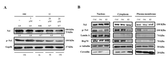 Finally, we determined whether the treatment with 12 could affect hNcl expression, phosphorylation, and cellular localization. Western blot analyses demonstrated that incubation of cancer cells with subtoxic amounts of the compound (20 μM) for 4, 6, or 16 h did not modify the hNcl levels, but the phosphorylation of the protein was inhibited after a 4 h treatment (Figure 4A,B).