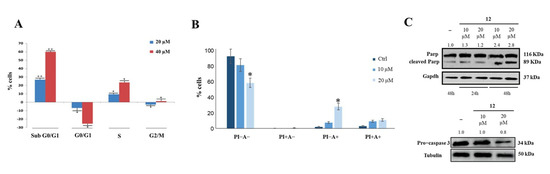 Cytofluorimetry was used to investigate the effects of compound 12 on cancer cell cycle and apoptosis, and it showed that this compound allowed cell accumulation in the subG0/G1 phase in a dose-dependent manner (Figure 5A). Annexin V-FITC/PI was then used to study the effect of compound 12 on cell death; it was found that a 48 h treatment produced an approximately 20% increase in early apoptosis (Figure 5B), as confirmed by Parp and pro-Caspase 3 cleavage (Figure 5C).