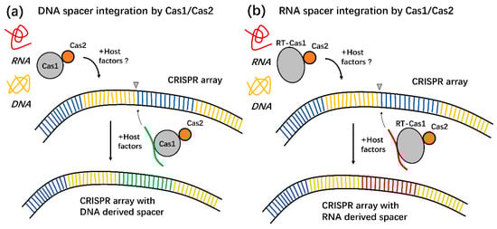 Schematic diagram of DNA and RNA spacers acquisition by CRISPR-Cas systems. (a) Small segments of invasive DNA are assimilated into CRISPR arrays by Cas1 and Cas2 in a canonical spacer acquisition process that allows adaptive immunity in a wide variety of bacteria and archaea. (b) In the type Ⅵ CRISPR systems, an RT fused to Cas1 enables the acquisition of spacer sequences directly from RNA. This process can mediate adaptive immunity against RNA-based parasites [40].