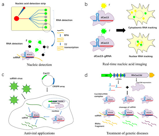 Nucleic acid detection and diagnosis technology is a measurement method integrating molecular biology and application techniques. The sensitivity, specificity, quick detection, and low cost are major considered issues for point-of-care testing (POCT). The adaptive immune system of CRISPR-Cas13 members in microorganisms can cleave RNA or trans-cleavage nucleic acids, which may be used for nucleic acid detection and diagnosis (Figure 4a) [47].