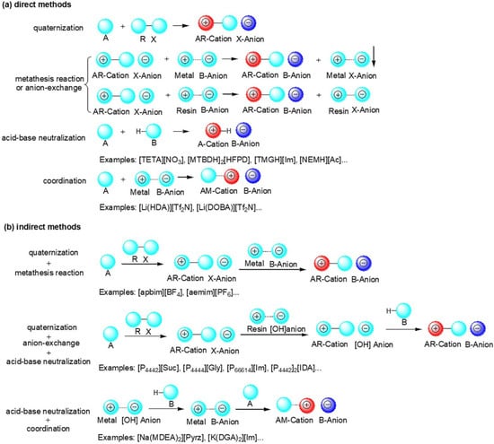 Generally, the synthesis of functionalized ILs includes several separated unit operations, such as quaternization, anion-exchange, acid-base neutralization, coordination, etc. According to the structure of functionalized ILs, the methods or pathway for the synthesis can be typically classified into two categories: direct methods and indirect methods. Direct methods include one of above-mentioned operations, while indirect methods include two or more of above-mentioned operations. The typical strategies for synthesis of functionalized ILs for CO2 capture can be found in Figure 3.