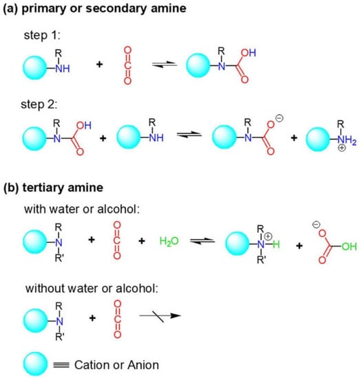 It is known that the most studied cation-functionalized ILs for CO2 capture should be amino-functionalized ILs, which were first reported by Davis et al. [] in 2002, two decades ago. They showed that 0.5 mole of CO2 per mole of IL was captured by 1-propylamide-3-butyl imidazolium tetrafluoroborate ([apbim][BF4]) via a carbamate mechanism (2 amino: 1 CO2). Compared with conventional alkanolamine aqueous solution (30 wt% monoethanolamine) for CO2 capture, amino grafted on cations of ILs showed high thermostability [,], while amino grafted on ILs showed high capture capacity compared with conventional ILs []. Subsequently, a number of amino-grafted cation-functionalized ILs were reported for efficient CO2 capture [,,,,]. The mechanisms of amino–CO2 reaction in ILs are similar to those in aqueous alkanolamine solutions. Compared with primary and secondary amines, tertiary amine is considered unreactive with CO2 under anhydrous conditions (Figure 4). However, He et al. [] reported that tertiary amino-containing Li-chelated cation-functionalized ILs, [PEG150MeBu2NLi][Tf2N] and [PEG150MeTMGLi][Tf2N], could achieve high CO2 capacities, 0.66 and 0.89 mol CO2 per mol IL, respectively, via coordination with lithium ion.