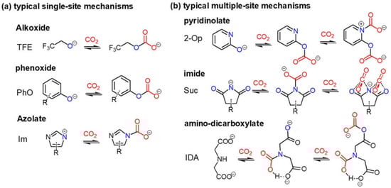 Typical (a) single-site and (b) multiple-site mechanisms of non-amino anion-CO2 reactions.