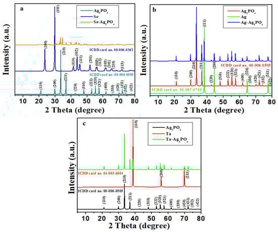 XRD pattern of Se-Ag3PO4 (a), Ag-Ag3PO4 (b), and Ta-Ag3PO4 (c).