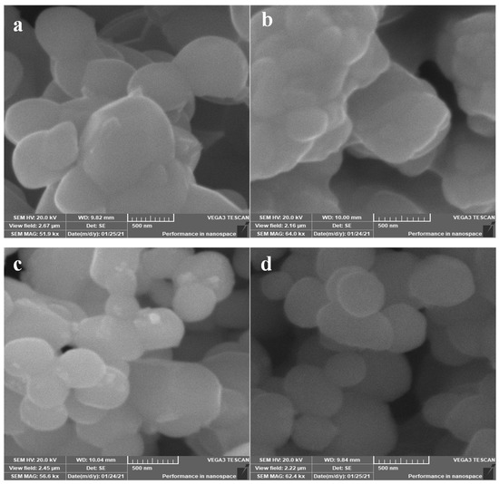 The XRD pattern of Ag3PO4, Se-Ag3PO4, Ag-Ag3PO4, and Ta-Ag3PO4 nanoparticles is presented in Figure 1a–c. It has been observed that in all cases, peaks are well indexed with standard cards, confirming the formation of Se-Ag3PO4, Ag-Ag3PO4, and Ta-Ag3PO4 nanoparticles. The peaks in Ag3PO4 correlate well with Ag3PO4 ICDD card no. 00-006-0505, showing the cubic structure. Se-Ag3PO4, Ag-Ag3PO4, and Ta-Ag3PO4 nanoparticles exhibit related diffraction peaks similar to those of Ag3PO4. Similarly, Se, Ag, and Ta diffraction peaks correlate with ICDD card no. 00-006-0362, 01-087-0719, 04-003-6604, corresponding to hexagonal and cubic structures, respectively. The diffraction peaks of Se, Ag, and Ta matched with the Se-Ag3PO4, Ag-Ag3PO4, and Ta-Ag3PO4 peaks. It was further observed that Ag-Ag3PO4 and Ta-Ag3PO4 exhibited the highest purity as compared with Se-Ag3PO4 nanoparticles. The morphology and size of Ag3PO4, Se-Ag3PO4, Ag-Ag3PO4, and Ta-Ag3PO4 nanoparticles were investigated by SEM. The analysis of Figure 2a,b shows the formation of plate-like structure in the case of Ag3PO4 and Se-Ag3PO4 with an average size of 300–500 nm. However, Ag-Ag3PO4 and Ta-Ag3PO4 nanoparticles show the formation of nano-spheres with an average size of 300–500 nm (Figure 2a–d). Moreover, EDX analysis reveals the presence of Se, Ag, P, O, and Ta in Se-Ag3PO4, Ag-Ag3PO4, and Ta-Ag3PO4 nanoparticles (Figures S1–S4). Additionally, EDX mapping was performed to establish the distribution of Se, Ag, P, O, and Ta in Se-Ag3PO4, Ag-Ag3PO4, and Ta-Ag3PO4 nanoparticles. The results illustrate the successful preparation of Ag3PO4, Se-Ag3PO4, Ag-Ag3PO4, and Ta-Ag3PO4 nanoparticles.