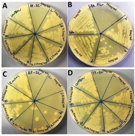MHA plates showing MBC values for E. coli ATCC 25922. Plate (A) showing MBC value of 2 mg/mL for Ag3PO4, (B) 16 mg/mL for Se-Ag3PO4, (C) 0.5 mg/mL for Ag-Ag3PO4, and (D) 1 mg/mL for Ta-Ag3PO4, respectively.