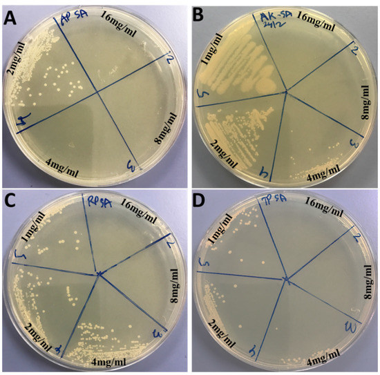 MHA plates showing MBC values for S. aureus ATCC 25923. Plate (A) showing MBC value of 4 mg/mL for Ag3PO4, (B) 8 mg/mL for Se-Ag3PO4, (C) 8 mg/mL for Ag-Ag3PO4, and (D) 8 mg/mL for Ta-Ag3PO4, respectively.