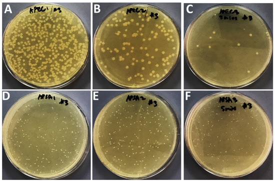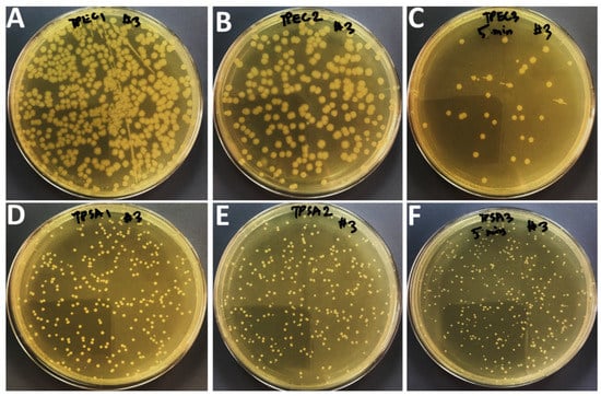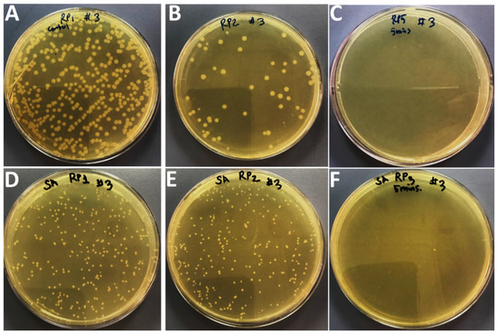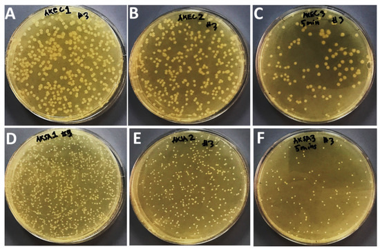 Effects of Ag3PO4 on the growth of E. coli (panel (A–C)) and S. aureus (panel (D–F)). (A,D); without compound and sonication, (B,E) with compound but without sonication, and (C,F); with compound and 5 min of sonication.