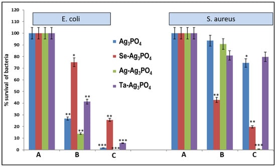 2.2. Antibacterial Activity Ag3PO4, Se-Ag3PO4, Ag-Ag3PO4, and Ta-Ag3PO4 Nanoparticles