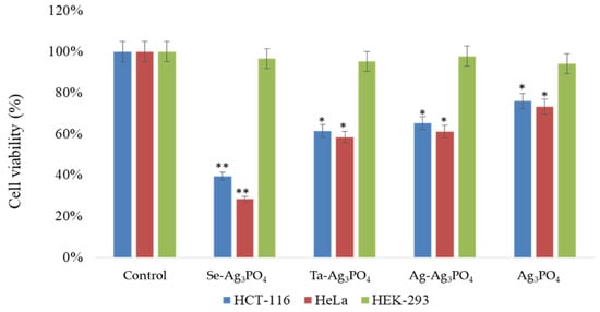 Cell viability using MTT Assay: It shows the impact of treatment of Ag3PO4, Se-Ag3PO4, Ag-Ag3PO4, and Ta-Ag3PO4 on HCT-116 and HeLa cell viability post 48 h treatment. * p < 0.05; ** p < 0.01.