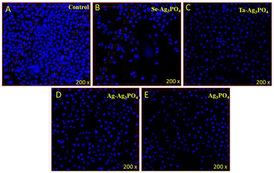 In the present study we used DAPI (4’,6-diamidino-2-phenylindole) to examine the cancer cell DNA after the treatments. DAPI is a fluorescent stain that binds strongly to AT-rich regions in the DNA. DAPI is a blue-fluorescent DNA stain that exhibits ~20-fold enhancement of fluorescence upon binding to AT regions of dsDNA. Because of its high affinity for DNA, it is also frequently used for counting cells, measuring apoptosis, sorting cells based on DNA content, and as a nuclear segmentation tool in high-content imaging analysis. The treatment of Ag3PO4, Se-Ag3PO4, Ag-Ag3PO4, and Ta-Ag3PO4 resulted in a significant decrease in the number of colon cancer cells, as the number of DAPI-stained cells appears to be substantially lower in the Ag3PO4, Se-Ag3PO4, Ag-Ag3PO4, Ta-Ag3PO4-treated cells vs control cells (Figure 12B–D). The decline in cancer cells is the result of after the programmed cell death or apoptosis, whereas the control group did not show any inhibition towards colon cancer cells (Figure 12A). In addition, we also observed that Ag3PO4, Se-Ag3PO4, Ag-Ag3PO4, and Ta-Ag3PO4-treated cells showed change in the cancer nuclei morphology as they shrank (Figure 12B–E), compared to control cells (Figure 12A), which suggests that cancer cells are undergoing apoptosis.