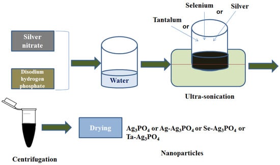 0.5 g silver nitrate was added to 30 mL of water in a beaker. After sonicating for 5 min, 0.3 g disodium hydrogen phosphate (Na2HPO4) in 10 mL of water was added dropwise to the silver nitrate solution and ultra-sonicated for 20 min. After that, 0.2 g silver or selenium or tantalum powder was added to the ultra-sonication mixture and sonication was carried on for a further 40 min. The products were centrifuged, washed with water/ethanol and dried to give Se-Ag3PO4, Ag-Ag3PO4, and Ta-Ag3PO4. The same procedure was repeated to prepare Ag3PO4 except for the addition of silver or selenium, or tantalum powder (Figure 13).