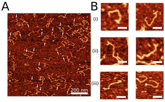 - Billingsley, D.J.; Crampton, N.; Kirkham, J.; Thomson, N.H.; Bonass, W.A. Single-Stranded Loops as End-Label Polarity Markers for Double-Stranded Linear DNA Templates in Atomic Force Microscopy. Nucleic Acids Res. 2012, 40, e99. [Google Scholar] [CrossRef] [PubMed]