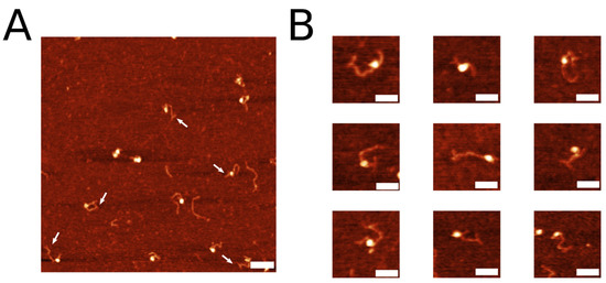 The 3WJ was assembled by annealing three synthetic DNA oligonucleotides (Figure 1A) to form a construct shown in Figure 1B. Oligonucleotide Y2 contains six T residues to provide additional flexibility to the joint of the junction [22,23]. The lengths of the arms of the junction are 40 bp, 39 bp, and 20 bp between Y1–Y2, Y2–Y3, and Y1–Y3, respectively. The 3WJ construct was extracted from the gel and ligated to the sticky end of the DNA with its 3 nt overhang. DNA-3WJ samples were then deposited on functionalized APS-mica for AFM imaging as described in the methods section. One scan of representative AFM images of the labeled DNA is shown in Figure 2A. White arrows indicate the presence of the 3WJ label on the substrate. The yield of DNA labeling was measured by counting the number of clearly defined DNA labels compared with the total of clearly defined DNA molecules and was determined to be 69% (n = 198), indicating successful visualization of the label using AFM.