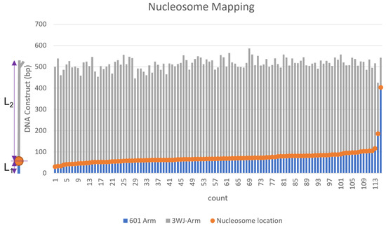 Mapping data from the analysis of nucleosomes assembled on the DNA template containing the nucleosome-specific and non-specific sequences. On the left, is a schematic of the DNA construct with the nucleosome bound (orange dot). The nucleosome position was measured from the center of the nucleosome particle to the DNA end. The grey bars (L2) correspond to the distance measured from the end of the 3WJ to the center of the nucleosome, and the blue bars (L1) show the distance from the center of the nucleosome to the unlabeled end of the DNA. 5 nm was subtracted from the measurement of each DNA flank to account for the size contributed by the nucleosome core. The variable overall contour lengths of the DNA are due to the varying wrapping efficiency of the nucleosome.