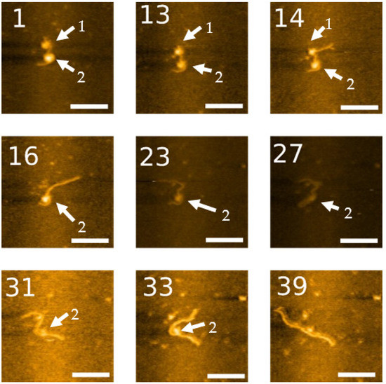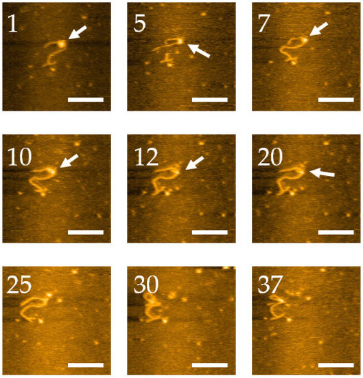 High-speed AFM imaging of nucleosome dynamics on labeled DNA. The nucleosome is indicated with arrows. Scale bars indicate 50 nm. The numbers in each image are their frame number in the movie. The numbers in each image are their frame number in the movie. The complete set of frames can be visualized in Movie S2.