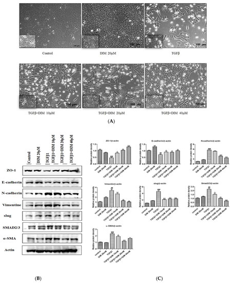 The mesenchymal phenotype induced by the TGF-β1 treatment was assessed by observing cell morphology under a phase-contrast microscope at X100 and X400 magnifications. As shown in Figure 2A, the DIM treatment suppressed TGF-β1-induced mesenchymal properties by restoring a honeycomb and spindle-like morphology to a polygonal morphology with a tight arrangement in comparison to the treatment with TGF-β1 only. Furthermore, we performed Western blotting to determine the effect of DIM on the expression of mesenchymal and epithelial markers. As shown in Figure 2B, DIM effectively restored levels of epithelial markers E-cadherin and ZO-1, whereas it reduced expression levels of mesenchymal markers such as N-cadherin, vimentin, slug, and SMAD2/3 compared with treatment with TGF-β1 only.