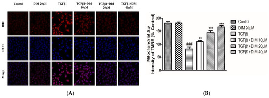 The changes in mitochondrial membrane potential were determined using a tetramethylrhodamine ethyl ester perchlorate (TMRE) mitochondrial membrane potential assay kit (Abcam) following the manufacturer’s instruction. The AML-12 cells were seeded into 96-well plates at a cell density of 1 × 104 cells per well and cultured for 24 h. These cells were treated with a medium containing recombinant TGF-β1 at 5 ng/mL and DIM at indicated concentrations (0, 10, 20, and 40 µM) for 24 h. The medium was then discarded, and the cells were stained with TMRE (400 nmol/L) for 20 min at room temperature in the dark. After the cells were washed twice with PBS, TMRE intensity was measured at excitation and emission wavelengths of 549 nm and 575 nm, respectively, using a fluorescence plate reader.