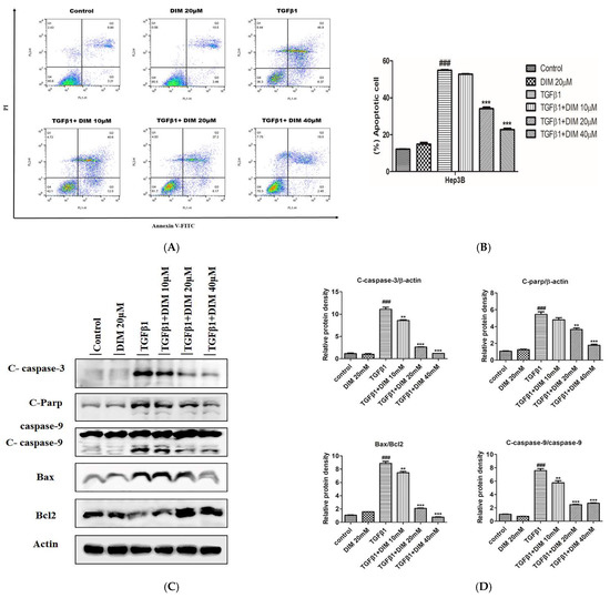 The TGF-β1-induced apoptosis of the hepatocytes was evaluated by conducting flow cytometry analysis. As shown in Figure 4A,B, the treatment with DIM significantly suppressed the cell death induced by TGF-β1 in a dose-dependent manner compared to the cells treated with TGF-β1 alone. Furthermore, Western blot revealed that the DIM treatment remarkably reduced the protein expression levels of pro-apoptotic markers such as cleaved caspase-3,9, cleaved-Parp, and Bax but increased the expression levels of anti-apoptotic markers such as Bcl2 as compared with treatment with TGF-β1 only, as shown in Figure 4C,D.