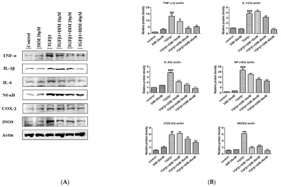 TGF-β1 plays a crucial role in the activation of acute and chronic inflammatory responses. It mediates leukocyte recruitment that causes the progression of hepatocyte damage [31]. To determine whether DIM could repress TGF-β1-induced inflammation in AML12 cells, we performed a Western-blot analysis to evaluate levels of inflammation regulatory proteins. As shown in Figure 5A,B, the DIM treatment significantly reduced the expression levels of important cytokines (TNF-α, IL-6, IL-1β) but elevated protein levels of cyclooxygenase (COX-2) and inducible nitric oxide (iNOS) in comparison to the treatment with TGF-β1 only, indicating that DIM might have decreased the TGF-β-induced fibrosis of hepatocytes by repressing inflammatory responses.
