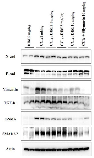 Consistent with our in vitro findings, DIM significantly reversed alternations of CCl4-induced EMT dose-dependently in mouse livers, as shown in Figure 8. Immunoblot also revealed that DIM remarkably inhibited the expression of TGF-β1 and Smad 2/3 compared to the treatment with CCl4 only group, as shown in Figure 8. These results suggest that the hepatic EMT and TGF-β1/Smad cascade can be regulated by DIM both in vitro and in vivo.