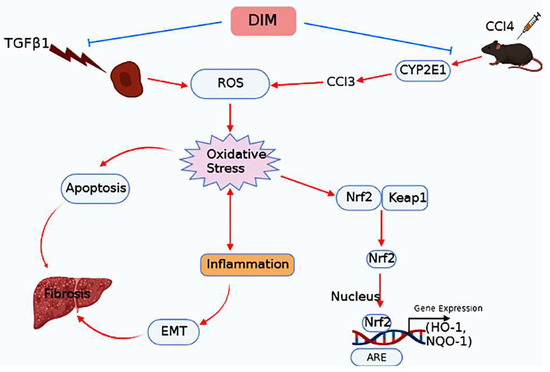 A schematic diagram showing molecular mechanisms involved in the protective effect of DIM against chronic liver injury by modulating ROS, oxidative stress, EMT, and fibrosis. In the figure, DIM inhibits TGF-β1-induced EMT by inhibiting intracellular ROS, oxidative stress, and apoptosis of heptocytes to prevent fibrosis, whereas DIM protects mice against CCl4-induced chronic liver injury by inhibiting ROS-mediated oxidative stress and Nrf2 cascade activation, thus reducing inflammation, EMT, and fibrosis.