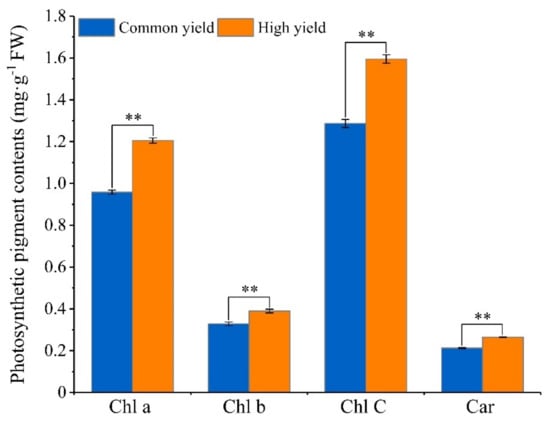 Photosynthetic pigment contents of masson pine needles in the high and common resin yield. FW means fresh weight. “Common yield” means the common resin-yielding clone, and “High yield” means the high resin-yielding clone. Error bars refer to the standard deviation (SD) of three biological replicates. ** indicates a significant difference between the high and common ones at p < 0.01. Chl a, chlorophyll a; Chl b, chlorophyll b; Chl C, total chlorophyll; Car, carotenoids.