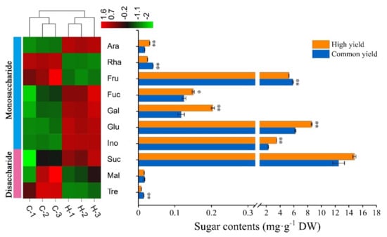 Sugar contents of masson pine needles in the high and common resin yield. DW means dry weight. “Common yield” means the common resin-yielding clone, and “High yield” means the high resin-yielding clone. Error bars refer to the standard deviation (SD) of three biological repeats. * and ** indicate significant differences between the high and common ones at p < 0.05 and p < 0.01, respectively. C-1, C-2, and C-3 represent three biological repeats of common ones, H-1, H-2, and H-3 represent three biological repeats of a high one. The color brightness represents the degree of the content difference, as shown in the color bar. Ara, D-arabinose; Rha, L-rhamnose; Fru, D-fructose; Fuc, L-fucose; Gal, D-galactose; Glu, glucose; Ino, inositol; Suc, sucrose; Mal, maltose; Tre, trehalose.