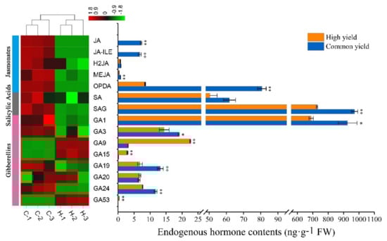 Endogenous hormone levels of masson pine needles in the high and common resin yield. FW means fresh weight. “Common yield” means the common resin-yielding clone, and “High yield” means the high resin-yielding clone. Error bars refer to the standard deviation (SD) of three biological repeats. * and ** indicate significant differences between the high and common ones at p < 0.05 and p < 0.01, respectively. C-1, C-2, and C-3 represent three biological repeats of the common one, H-1, H-2, and H-3 represent three biological repeats of the high one. The color brightness represents the degree of the content difference, as shown in the color bar. GA15 is too small to be seen and GA53 is too low to be detected in the common one, and JA, as well as JA-ILE, are too low to be detected in the high one. JA, jasmonic acid; JA-ILE, jasmonoyl-L-isoleucine; H2JA, dihydrojasmonic acid; MEJA, methyl jasmonate; OPDA, cis (+)-12-oxophytodienoic acid; SA, salicylic acid; SAG, salicylic acid 2-O-β-glucoside; GA1, gibberellin A1; GA2, gibberellin A2; GA3, gibberellin A3; GA4, gibberellin A4; GA7, gibberellin A7; GA9, gibberellin A9; GA15, gibberellin A15; GA19, gibberellin A19; GA20, gibberellin A20; GA24, gibberellin A24; GA53, gibberellin A53.