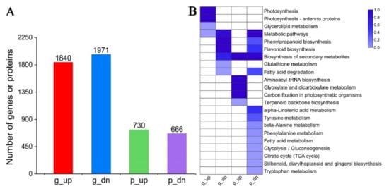 Identification of DEGs/DEPs. (A) Number of DEGs/DEPs. (B) Functional category enrichment of DEGs/DEPs. DEGs/DEPs were classified into two groups of up-regulated or down-regulated, without DEGs and DEPs comparison. The degree of the pathway enrichment was indicated according to the value of −log(q-value), as shown in the color bar. Each group was indicated by expression level (“g” for gene and “p” for protein, respectively) and regulatory direction (“up” for up-regulated and “dn” for down-regulated, respectively). The color brightness represents the degree of significant enrichment of pathways, as shown in the color bar.