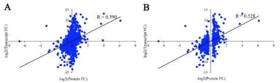 Correlation between the expression of proteins and mRNAs. (A) Correlation of all quantified proteins and their corresponding mRNAs. (B) Correlation of DEPs and their corresponding mRNAs. “R” represents the correlation coefficient calculated by the Pearson correlation test, and “FC” represents fold change.