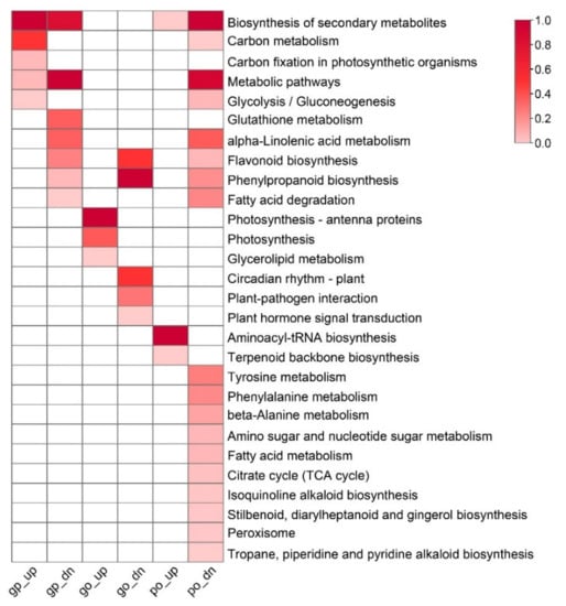 Functional category enrichment of DEGs/DEPs. DEGs/DEPs were classified into a total of 6 groups according to RNA-Seq and iTRAQ integrative analysis. The degree of the pathway enrichment was indicated according to the value of −log(q-value), as shown in the color bar. Each group was indicated by expression level (“go” for gene only, “po” for protein only, and “gp” for both gene and protein level, respectively) and regulatory direction (“up” for up-regulated and “dn” for down-regulated, respectively). The color brightness represents the degree of significant enrichment of pathways, as shown in the color bar.