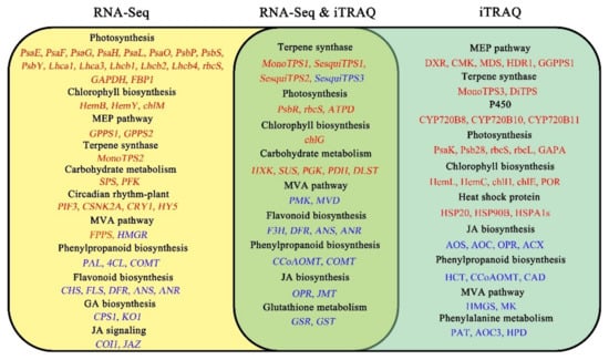 There were 1666 up-regulated and 1734 down-regulated DEGs whose corresponding proteins were not differentially expressed (Figure S4). Consistent with the results of functional enrichment, the expression levels of genes involved in photosynthesis were significantly elevated, including photosystem I subunit PsaE, PsaF, PsaG, PsaH, PsaL, and PsaO, photosystem II protein PsbP, PsbS, and PsbY, chlorophyll a/b binding protein Lhca1, Lhca3, Lhcb1, Lhcb2, and Lhcb4, and Calvin cycle-related genes like rbcS, glyceraldehyde 3-phosphate dehydrogenase (GAPDH) and fructose-1,6-bisphosphatase I (FBP1). Accordingly, the expression levels of genes related to chlorophyll biosynthesis, including porphobilinogen synthase (HemB), protoporphyrinogen/coproporphyrinogen III oxidase (HemY), and magnesium-protoporphyrin O-methyltransferase (chlM), were notably elevated. Consistently, the expression levels of genes associated with terpenoid biosynthesis were also greatly elevated, including MVA pathway-related genes like farnesyl diphosphate synthase (FPPS), MEP pathway-related genes like geranyl diphosphate synthases (GPPS1 and GPPS2), and monoterpene synthase-like beta-pinene synthase (MonoTPS2). In addition, sucrose-phosphate synthase (SPS) referred to as sucrose biosynthesis and 6-phosphofructokinase (PFK) referred to as glycolysis were also dramatically up-regulated. Interestingly, several genes related to circadian rhythm-plant, including phytochrome-interacting factor 3 (PIF3), casein kinase II subunit alpha (CSNK2A), cryptochrome 1 (CRY1), and transcription factor HY5 (HY5), were obviously up-regulated (Table S3). On the contrary, the expression levels of genes involved in phenylpropanoid biosynthesis significantly declined, including phenylalanine ammonia-lyase (PAL), 4-coumarate-CoA ligase (4CL), and caffeic acid 3-O-methyltransferas (COMT). Consistently, the expression levels of genes that participated in flavonoid biosynthesis, including chalcone synthase (CHS), flavonol synthase (FLS), DFR, ANS, and ANR, were greatly downregulated. Besides, GA biosynthesis genes including ent-copalyl diphosphate synthase 1 (CPS1) and ent-kaurene oxidase 1 (KO1) as well as JA signaling genes including three coronatine-insensitive proteins 1 (COI1s) and two jasmonate ZIM domain-containing protein (JAZs) were significantly down-regulated (Table S3).