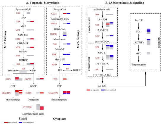 Heatmap of DEGs and DEPs related to terpenoid biosynthesis (A), JA biosynthesis & signaling (B). Up- and down-regulated DEGs/DEPs were indicated by red and blue colors, respectively. Nonsignificant genes/proteins were indicated by a gray color. The cells (from left to right) in the heatmap represent the expression change of gene and protein, respectively. The deletion of the cells on the right represents that the protein corresponding to the gene was not detected in the iTRAQ experiment.