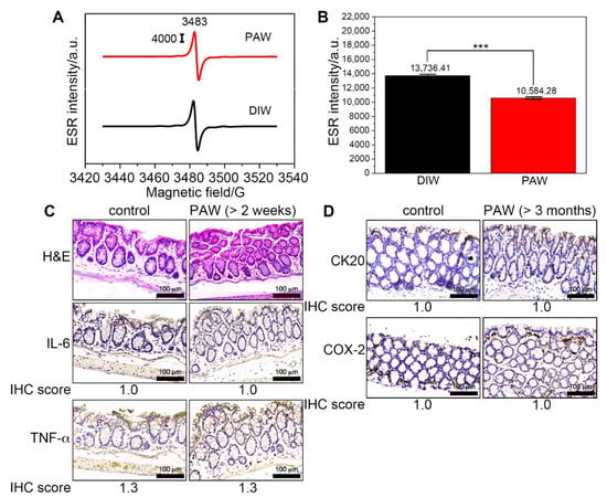 We first demonstrated the scavenging ability of PAW against 2,2-diphenyl-1-picrylhydrazyl (DPPH) radicals (Figure 1A). The one electron spin resonance (ESR) signal located at 3482 G is characteristic of DPPH radicals []. Compared to the deionized water-based solution, the respective ESR intensity significantly decreased by ca. 23% ((13,736 − 10,584) × 100%/13,736) for the PAW-based solution, as shown in ESR intensity in Figure 1B. Here, we showed that PAW caused an insignificantly histopathological change (Figure 1C, the top panel). Colon inflammation was then assessed by changes in levels of IL-6 and TNF-α, two critical proinflammatory cytokines [,]. The PAW-induced inflammatory response was evaluated by examining the levels of TNF-α and IL-6 in the colonic epithelial cells. As shown in Figure 1C, the colons of control mice and mice with PAW consumption for over 2 weeks showed small levels of positively stained cells of IL-6 (IHC score = 1.0, the middle panel) and TNF-α (IHC score = 1.3, the bottom panel) after the pathologists scored. In addition, no significant difference was detected in the levels of CK20 and COX-2 between the colons of normal mice that did not and did drink PAW for up to 3 months (Figure 1D). The percentages of positively stained cells of CK20 and COX-2 were all below 33% (IHC score = 1.0).