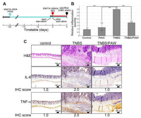 An experimental mouse model of IBD involving PAW consumption and the rectal administration of TNBS was established, as shown in the study flowchart Figure 2A. Histological inflammation was assessed based on the number of epithelial neutrophils in the induced lesions using a simple scoring system: 1, normal (no inflammatory cells); 2, mild active (cryptitis but no crypt abscesses); 3, moderate active (few crypt abscesses); and 4, severe active inflammation (numerous crypt abscesses) []. When more than one colon biopsy sample had been collected, the highest grade of histological inflammation within that segment was recorded. The mean values of the histological scores of inflammation in the groups are presented in Figure 2B. In sum, TNBS injection resulted in severe active inflammation with architectural abnormalities, dense inflammatory cell infiltrates, and frequent crypt abscesses. Through PAW consumption, the inflammation severity was reduced with fewer architectural abnormalities and a near absence of crypt abscess (Figure 2C, the top panel). The expression of IL-6 (Figure 2C, the middle panel) and TNF-α (Figure 2C, the bottom panel) was higher (IHC score = 2.0 for IL-6 and TNF-α) in the intestinal epithelium of mice with TNBS-induced IBD, but both declined when mice further consumed PAW (IHC score = 1.0 for IL-6 and TNF-α).