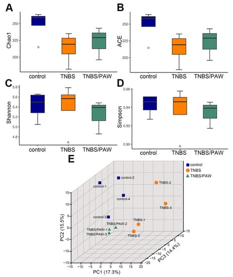To determine the similarities among groups of microbial communities, 3D-PCA was performed based on the correlation matrix at the ASV level and indicated by the three principal component scores of 17.3% (PC1 axis), 15.5% (PC2 axis), and 14.4% (PC3 axis), respectively (Figure 3E). Because of the high interindividual variation, clustering in the gut microbiota by TNBS-induced IBD and/or PAW intervention was evident. The results revealed that the gut microbiota of the control group and TNBS/PAW group was different from that of the TNBS group.