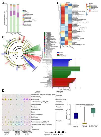 Different types of gut bacteria due to TNBS treatment and PAW consumption. (A) Histogram showing the relative levels of family across the three groups. (B) Heat map displaying the relative abundances of genus across the three groups. (C) Cladogram of the phylotypes that differed between the groups displayed according to effect size. Key contributors to the structural segregation of different groups were identified using LEfSe. Significant bacterial taxonomic groups are labeled, with the genus (g), family (f), species (s), or order (o). LDA scores of enriched bacterial taxa (LDA > 2 of LEfSe). Significantly enriched bacterial taxa from different groups were clustered. Differences represented by the color of the most abundant class were noted as: blue, control group; red, mice with TNBS treatment; green, mice with TNBS treatment and PAW consumption. LDA, linear discriminate analysis. (D) Bubble chart showing the relative abundance of amplicon sequence variants between genera (y-axis) in relation to the eleven different samples (x-axis). (E) MetagenomeSeq analyzing the relative abundance of the target Akkermansia genus among groups. The thick line in the boxplot represented the median number of reads for the cluster. * p < 0.05.