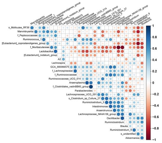 Spearman correlations between ASV-level microbial. Strong correlations are indicated by large circles, whereas weaker correlations are indicated by small circles. The colors of the circles denoted the nature of the correlation with dark blue indicating strong positive correlation and dark red indicating a strong negative correlation.