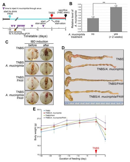 Significance of A. muciniphila to IBD. (A) Experimental protocol for TNBS-induced IBD, PAW consumption, and the rectal administration of A. muciniphila. The colors of the arrows denoted the time to start PAW consumption (light blue), induced IBD (red), sample stool for qPCR (brown), inject A. muciniphila through anus (purple), and end experiment (black). (B) Validation of A. muciniphila in stool of mice by qPCR. qPCR was performed with primers for A. muciniphila (BPID00026A, QIAGEN, Düsseldorf, Germany) and normalized with the total bacterial count (qPCR primers for total bacteria: 5′-GTGSTGCAYGGYYGTCGTCA-3′ and 5′-ACGTCRTCCMCNCCTTCCTC-3′; S for C/G, Y for C/T, R for A/G, M for A/C, and N for A/C/G/T). (C) Representative images of anus of mice. The anus of mice in different groups was imaged on the days before and after TNBS induction. (D) Representative images of colon length of mice. The bulging end of each colon is the mouse cecum. (E) Original body weight of mice throughout the experimental protocol. IBD, inflammatory bowel disease; TNBS, 2,4,6-trinitrobenzene sulfonic acid; PAW, plasmon-activated water; qPCR, quantitative real-time polymerase chain reaction. ** p < 0.01.