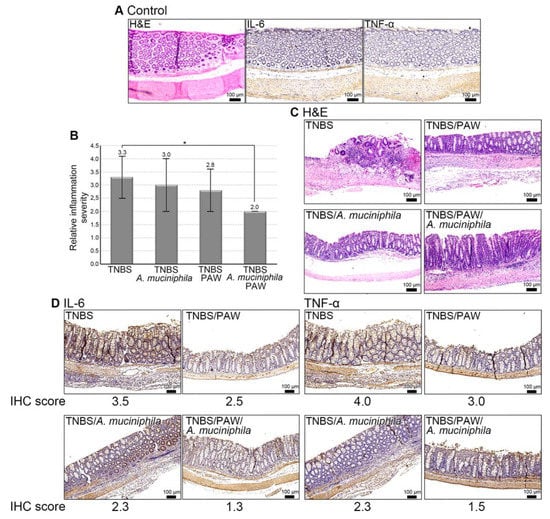No histological change and obviously signal intensity of IL-6 and TNF-α in the control mice (Figure 7A). However, histological analysis revealed that A. muciniphila injection and PAW consumption alleviated the inflammatory response in the TNBS-treated mice (Figure 7B). By contrast, TNBS treatment exacerbated mucosal damage with dense infiltration of inflammatory cells, and severe architectural change (upper left panel, Figure 7C). Notably, as shown in Figure 7C, A. muciniphila administration (bottom left panel), PAW pretreatment (upper right panel), or both (bottom right panel) attenuated TNBS-induced colon damage more substantially than did TNBS treatment alone, as indicated by a reduction in epithelial loss and resolution of inflammatory response. As shown in Figure 7D, the immunostaining signals of IL-6 (IHC score = 3.5) and TNF-α (IHC score = 4.0) were the highest in the colons of TNBS-treated mice but decreased when mice drank PAW (IHC score = 2.5 for IL-6 and 3.0 for TNF-α) or were treated with A. muciniphila (IHC score = 2.3 for IL-6 and TNF-α). However, the lowest immunoactivities of IL-6 (IHC score = 1.3) and TNF-α (IHC score = 1.5) in colons were detected in the TNBS-treated mice with both PAW consumption and A. muciniphila.