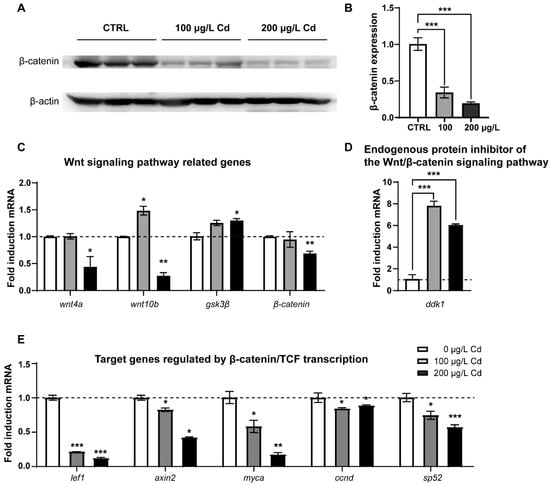 To assess the effects of Cd2+ exposure on the Wnt/-catenin signaling pathway, we examined the expression levels of Wnt-related proteins and genes in 6 dpf zebrafish larvae exposed to different levels of Cd2+. Six days after Cd2+ exposure, the content of β-catenin significantly decreased with the increase in Cd2+ levels (Figure 1A,B). To further understand the molecular basis of the Cd2+-modulated Wnt signaling pathway in zebrafish, the relative expression of key genes (wnt4a, wnt10b, gsk3β, and β-catenin), endogenous inhibitor ddk1, and target genes (lef1, axin2, myca, ccnd, sp52) were determined by qRT-PCR analyses. The results showed that Cd2+ exposure significantly downregulated the expression of wnt4a, wnt10b, β-catenin, lef1, axin2, myca, ccnd, and sp52, while it upregulated the expression of ddk1 and gsk3β (Figure 1C–E). Thus, the results of the protein and gene expression analyses consistently revealed that Cd2+ exposure could, to some extent, repress Wnt/β-catenin signaling in zebrafish larvae.