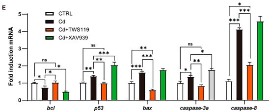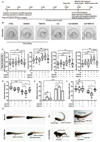 Newly-hatched zebrafish embryos were collected and washed with standard E3 embryo medium within one-hour postfertilization, and then were examined under the stereomicroscope (Olympus, Japan). Normally developing embryos were exposed to CdCl2, or in combination with Wnt agonist (3 μM TWS119)/inhibitor (3 μM XAV939) suspended in E3 medium, which was refreshed daily. The morphological characteristics of zebrafish embryos/larvae were recorded under the stereomicroscope at different developmental stages ranging from 2 hpf to 144 hpf. Briefly, mortality as well as other parameters including hatchability, body length, cardiac rate, and malformation of embryos/larvae were recorded as previously reported []. In addition, the early developmental process (from 2.5 hpf to 24 hpf) of zebrafish embryos was continuously video recorded and then analyzed through the high-throughput dynamic imaging system (DynaPlant, YPHbio, Beijing, China) in the Experiment Center of the School of Life Sciences, according to the user’s manual [].
