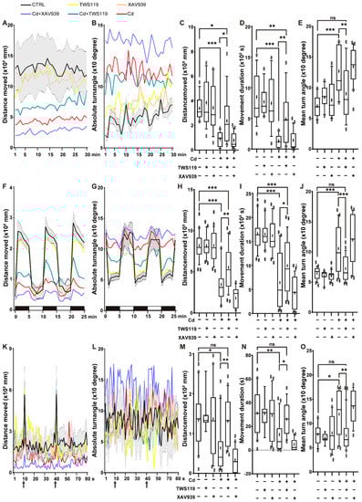 2.3. Activation of Wnt Signaling Pathway Alleviates the Inhibitory Effects of Cd2+ on Zebrafish Activity and Reactivity